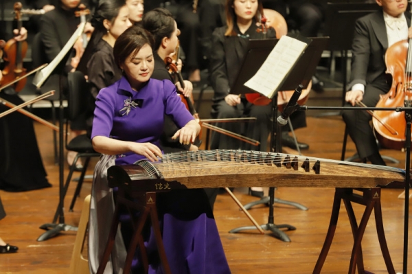 紧接着郝维亚的古筝协奏曲《万里无云》奏响,罗晶的指法繁而不乱,筝音清亮澄澈,乐曲在极具空间感的节奏中行进,营造出“万里无云、花雨满天”的空灵意境,尽显中西音乐交流之魅力。