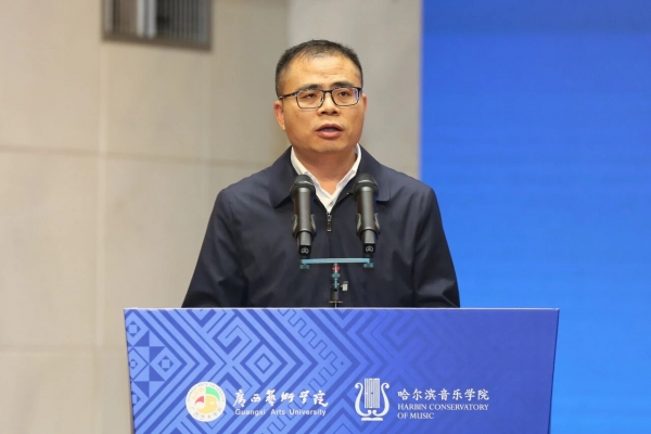广西艺术学院党委常委、副院长谢斌致欢迎词,对远道而来的哈尔滨音乐学院师生表达了热烈欢迎,对关心支持本次活动的广西壮族自治区民族宗教委员会及有关单位致以诚挚谢意。他介绍了广西艺术学院与哈尔滨音乐学院的办学特色以及本场音乐会的亮点;期待两校深化合作,共同为繁荣民族音乐事业、铸牢中华民族共同体意识奉献青春力量。