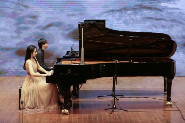 钢琴重奏《黄河》第三乐章《黄河愤》由哈尔滨音乐学院教师潘雨萌与广西艺术学院教师陈天乐携手演奏,以磅礴的气势、激昂的旋律,将黄河的汹涌澎湃与中华民族的不屈精神展现得淋漓尽致,钢琴的厚重音色在此刻迸发巨大能量,震撼全场。