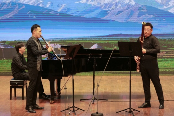 单簧管、巴松二重奏《赞歌》(胡松华作曲、邬娜改编)由哈尔滨音乐学院管弦系单簧管教师王宇与巴松教师程思浩合作演绎,单簧管的清亮与巴松的低沉巧妙搭配,侯汀担任钢琴艺术指导,三位演奏者默契配合,用西洋乐器演绎民族旋律,既保留了《赞歌》的经典韵味,又赋予其全新的艺术表达,展现出跨界融合的创新魅力。