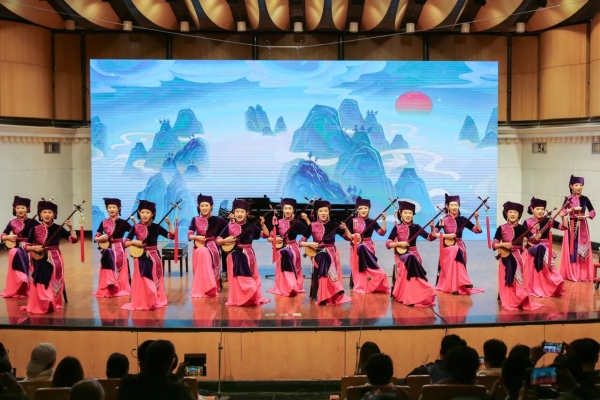 广西艺术学院“欢了”天琴表演艺术团带来了广西本土文化特色节目——壮族天琴弹唱《天上神曲》(梁绍武作词、陈威作曲),“欢了”天琴表演艺术团娴熟的天琴演奏与清甜演唱,旋律优美、意境悠远,将壮族非遗文化的鲜活生命力展现得淋漓尽致,让观众感受到广西本土艺术的独特魅力。