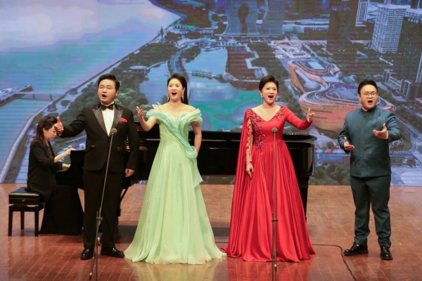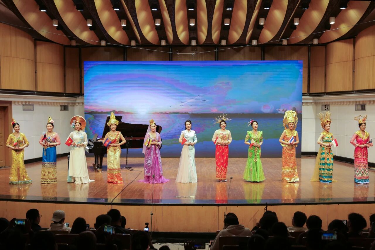女生小组唱《碧海丝路情谊长》(蔡昌卓作词、戴丽霞作曲)由广西艺术学院教师孙鑫、蒙丽妃、刘海嘉、朱艳雅及七位学生同台演唱。用歌声诠释“碧海”的灵动,用和声的层次展现“丝路”的悠远,让旋律流淌出文明交融的温暖。歌词里饱含对古往今来中外友好的赞颂以及对和平共处、情谊绵长的美好期许。
