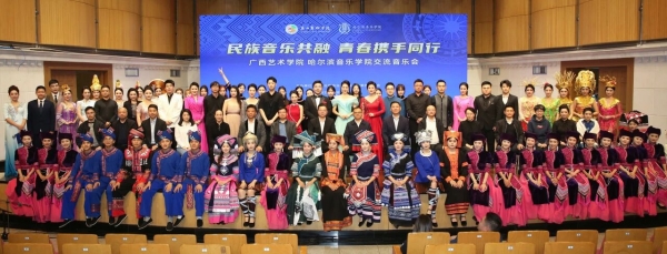 广西艺术学院党委书记刘伯贤,广西壮族自治区民族宗教事务委员会党组成员、副主任韦尚雄,哈尔滨音乐学院党委委员、副院长宛景森,广西艺术学院党委副书记毛茂林,党委常委、副院长谢斌等领导嘉宾莅临现场观演。来自两所高校的师生们携手登台,用精湛的艺术演绎,为现场观众带来了一场兼具地域风情与艺术高度的视听盛宴。
