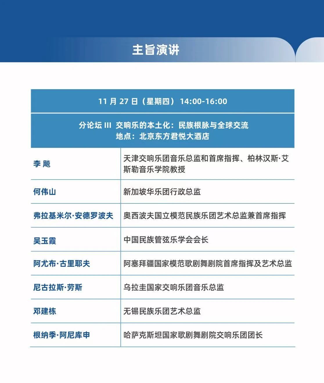 11月27日下午,2025世界交响乐北京论坛分论坛在北京东方君悦大酒店举行。吴玉霞会长与来自德国、新加坡、俄罗斯、阿塞拜疆、乌拉圭、哈萨克斯坦等国际音乐行业领域代表同台交流,围绕“交响乐的本土化:民族根脉与全球交流”这一重要议题展开深入探讨。