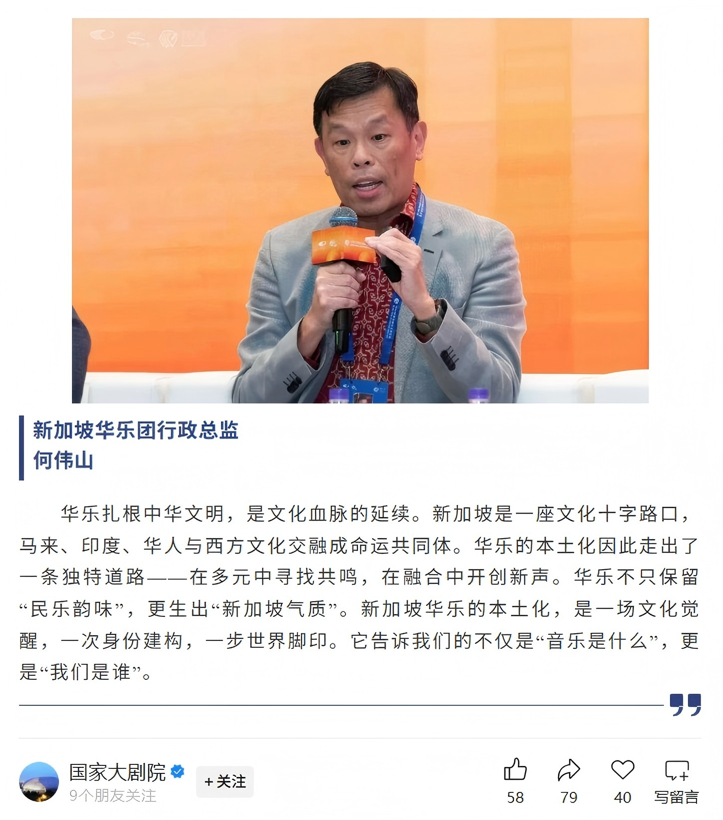 作为新加坡华乐团行政总监、新加坡华乐总会副会长,何伟山对于华乐的发展有着清晰且深刻的认知,他强调:“华乐的未来,既扎根于民族血脉,也生长在全球视野之中。”