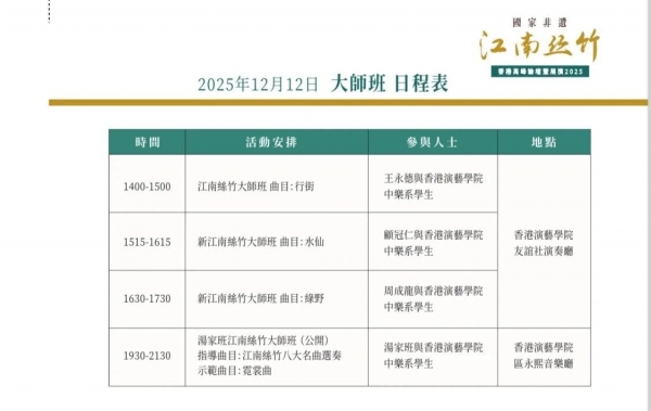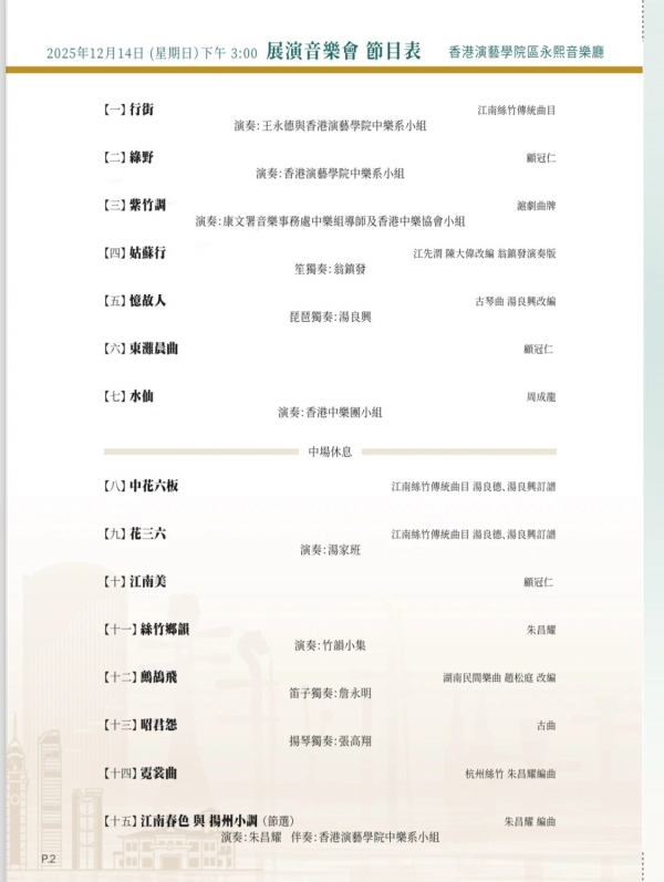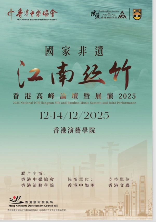 2025年12月12日至14日,由香港中乐协会与香港演艺学院联合主办、香港中乐团协办,香港文联支持在香港演艺学院成功举办的盛会——《国家非遗江南丝竹香港高峰论坛暨展演2025》圆满落幕,获得了专家及观众的支持及赞赏。