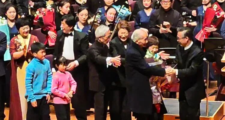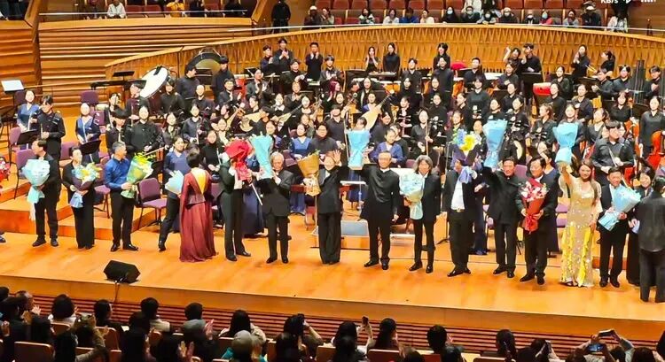 来自海内外的九名夏飞云教授的得意弟子指挥家和全体演职人员及台下观众掌声如潮,经久不息,欢迎夏飞云教授走向舞台