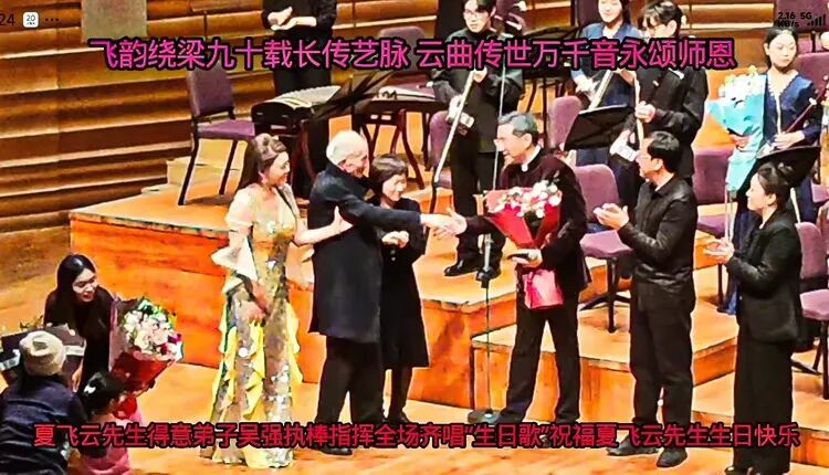 当音乐会最后一个音符落下,来自海内外的九名夏飞云教授的得意弟子指挥家和全体演职人员及台下观众掌声如潮,经久不息,欢迎夏飞云教授走向舞台。这时,夏飞云教授的得意弟子吴强教授执棒指挥全场齐唱《生日歌》,祝福民族音乐指挥专业创始人夏飞云先生90华诞生日快乐!