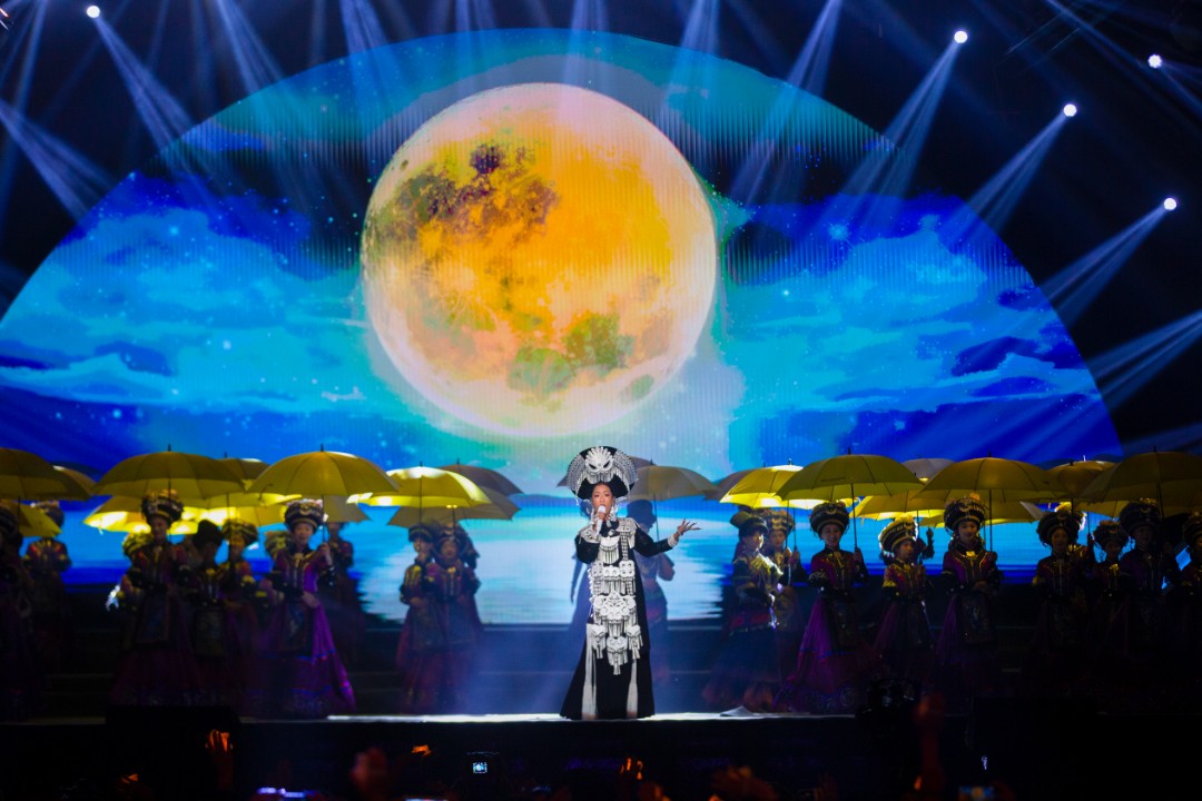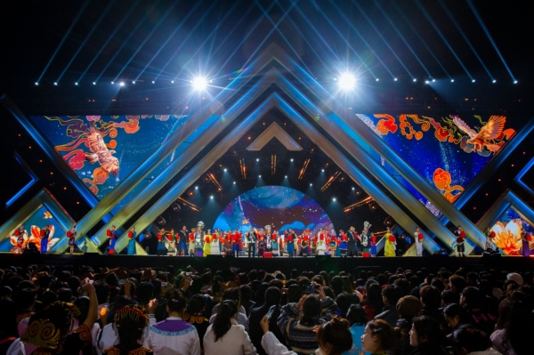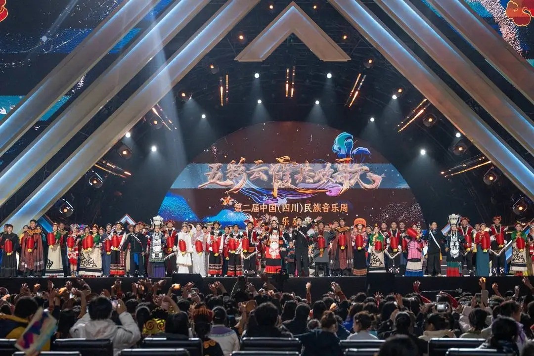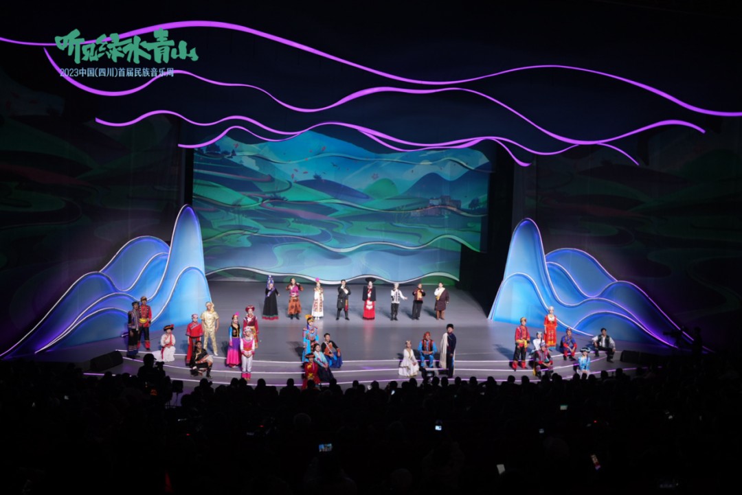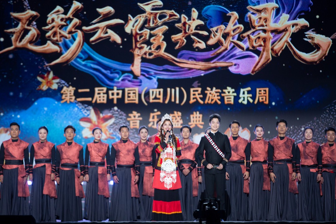 当晚,新编排的四川民歌《太阳出来喜洋洋》融合川剧表演、交响乐、民族乐器、电声乐队等表演形式,拉开了民族音乐盛典大幕。演出分为《太阳出来喜洋洋》《乐蕴山水·民族风》《韵光而行·民族潮》等五个章节。来自3个国家、13个民族的48组艺人齐聚一堂,共同演绎五彩云霞共欢歌的美好画卷。
