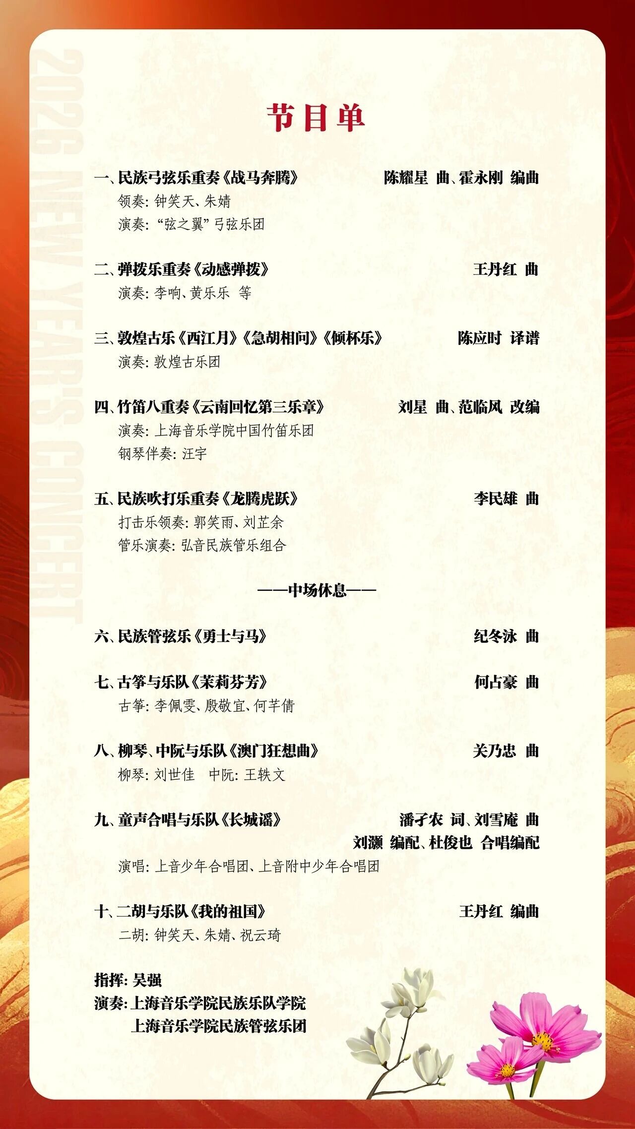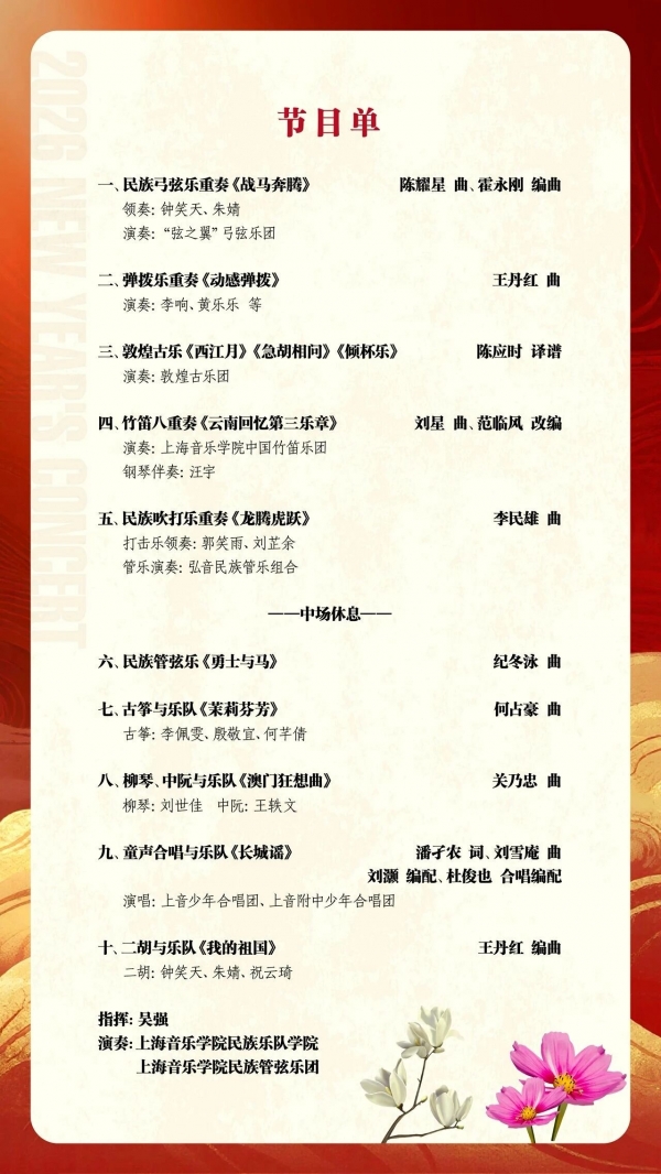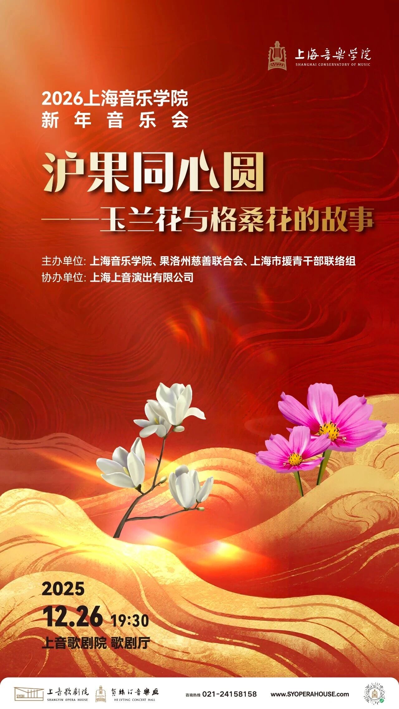 12月26日 ,“沪果同心圆——玉兰花与格桑花的故事”上海音乐学院2026年新年音乐会在上音歌剧院温情奏响。这场跨越千里的音乐之约,由上海音乐学院、果洛州慈善联合会、上海市援青干部联络组联合主办,是沪青两地同心筑梦的缩影,也是上音践行“铸牢中华民族共同体意识”的实践,全部票款净收入将定向捐赠予果洛州慈善联合会,支持当地美育教育教学项目。音乐会以民族弓弦乐重奏《战马奔腾》开场,激昂奔放的旋律,勾勒出昂扬奋进的精神图景;弹拨乐重奏《动感弹拨》则以充满现代感的节奏律动,为观众带来不一样的视听体验;《西江月》、《急湖相问》等古乐片段,用音乐搭建起古今文明对话的桥梁;笔锋一转,是少数民族音乐与现代作曲的碰撞——竹笛八重奏《云南回忆》的婉转灵动,赋予每个音符崭新活力;民族吹打乐重奏《龙腾虎跃》,于气势磅礴中奏出民族风貌。一曲曲风格迥异的民族音乐佳作,全方位展现了中国民族音乐的多元魅力与深厚底蕴。