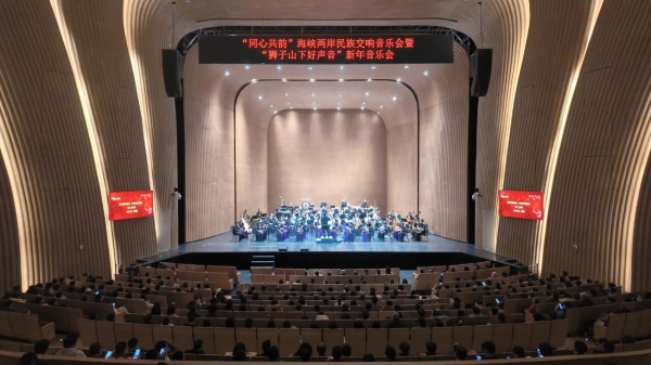 12月27日晚,苏州狮山大剧院内乐声悠扬、掌声激荡——“同心共韵”海峡两岸民族交响音乐会暨“狮子山下好声音”新年音乐会在此温暖奏响。中国广播民族乐团担纲演奏,乐团常任指挥葛亚南执棒,音乐会首席屈惠卿。这不仅是一场辞旧迎新的艺术盛宴,更是用优美旋律架设跨越海峡的音乐之桥,连接两岸同胞共叙情谊的文化纽带。艺术家们精选了多首民族管弦乐佳作和充满宝岛台湾风情的优美旋律。指挥与乐团默契合作,用经典民乐带领观众聆听海峡两岸同心共韵的节拍,共赏民族管弦乐恢宏奏响的华彩。