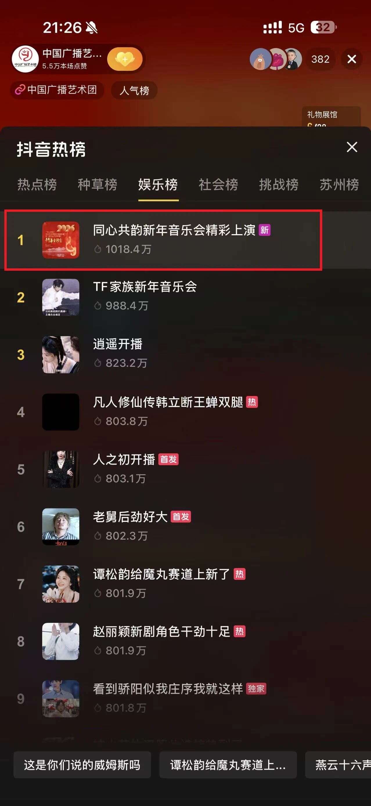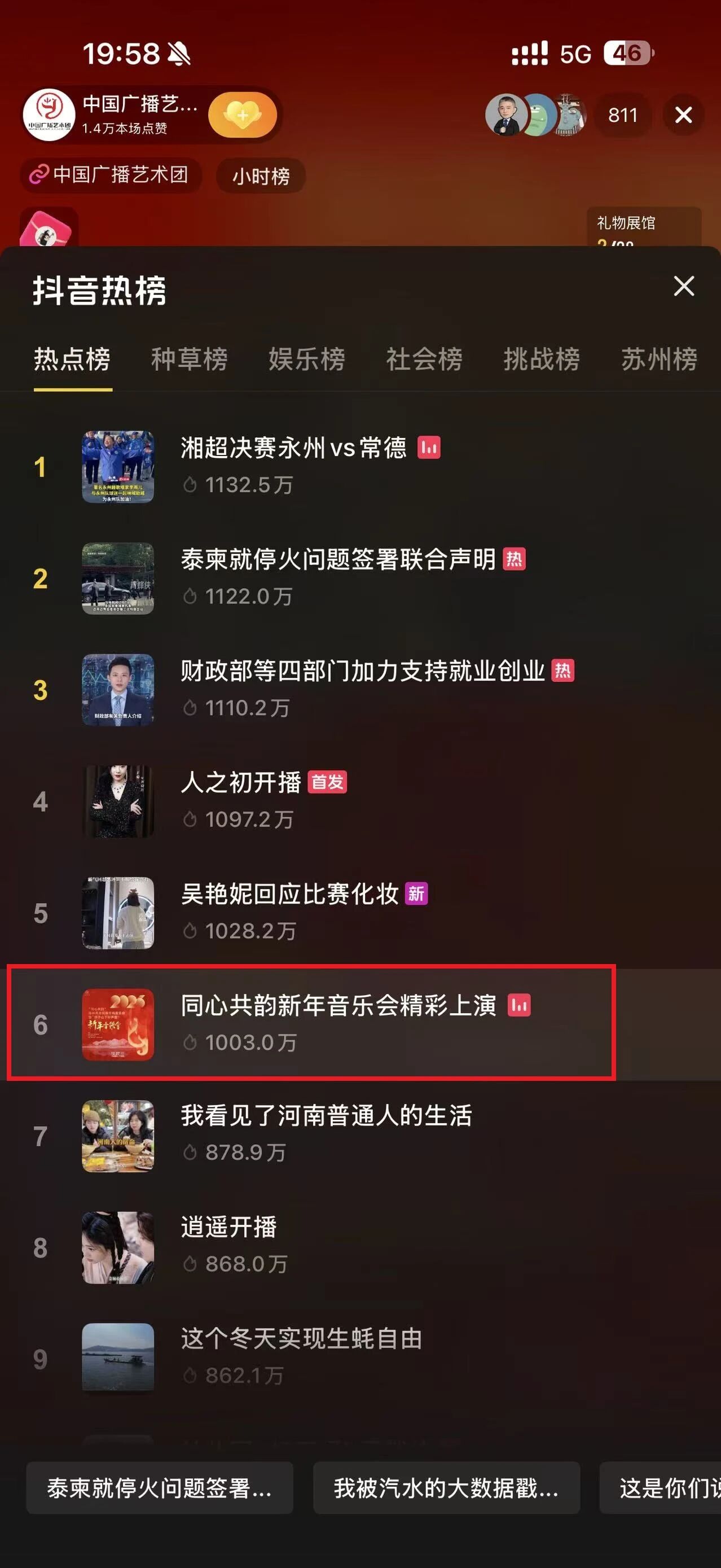 本场音乐会通过中国广播艺术团官方抖音号、苏州文旅、苏州高新区发布三大官方平台同步直播,一举冲上抖音热点榜第六名、娱乐榜第一名,让传统民乐在当代舞台与网络直播间交织呈现,共同演绎最美乐章。