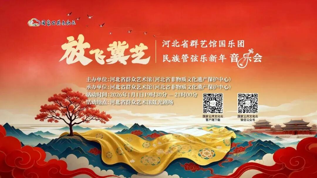 由河北省群众艺术馆(河北省非物质文化遗产保护中心)主办,河北省群艺馆国乐团、石家庄市教育局守望者教师民乐团出演的“放飞冀艺”河北省群艺馆国乐团民族管弦乐新年音乐会,将于2026年1月1日(星期四)19:30,在河北省群众艺术馆虹光剧场正式启幕。