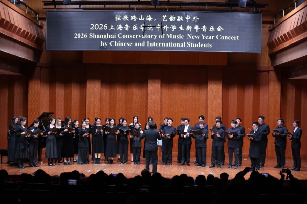 由上海音乐学院主办、国际教育学院承办的“弦歌跨山海,艺韵融中外”——2026上海音乐学院中外学生新年音乐会日前在贺绿汀音乐厅圆满举行。来自同济大学、华东师范大学和上海大学等十几所高校的中外师生代表和市民朋友们欢聚一堂,共同迎接崭新的2026年。