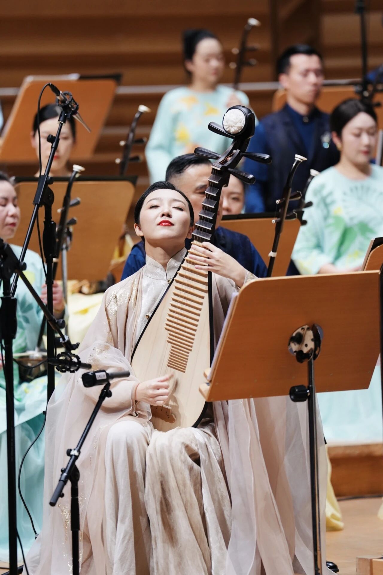 音乐会的核心亮点,无疑是顾冠仁先生于2025年全新创作的第五琵琶协奏曲《江南情景三章》的首演。这部作品由琵琶演奏家李胜男担任独奏,通过“小桥流水丝竹声”、“阖家欢唱紫竹情”、“生机盎然江南春”三个乐章,以琵琶丰富的语汇与民族管弦乐的恢宏笔触,描绘新时代江南的生机勃勃与雅致情韵。“这是我继《飞天》之后第二次首演顾老师的作品了!”琵琶演奏家李胜男说:“这部新作让我深切感受到顾老师心中江南的诗意与活力,也体会到艺术家永不枯竭的创作生命力!”