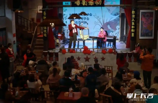 紧接着,文琴登场。这把由长沙音乐家协会文琴学会会长文正球于2002年发明的新型民族乐器,在《浏阳河》的旋律中展现出兼具拉弹的独特音色。台下的茶客也随着敲击桌面,哼起了熟悉的旋律。