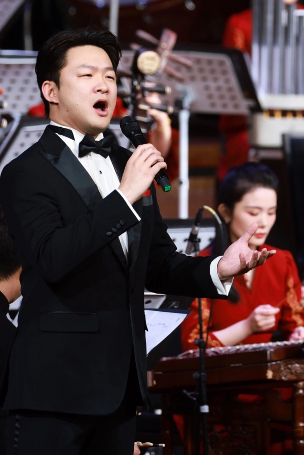 男高音李鹏飞以嘹亮的嗓音演绎《草原上升起不落的太阳》,歌声中流淌着对祖国的深情。