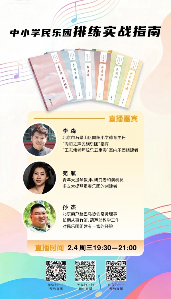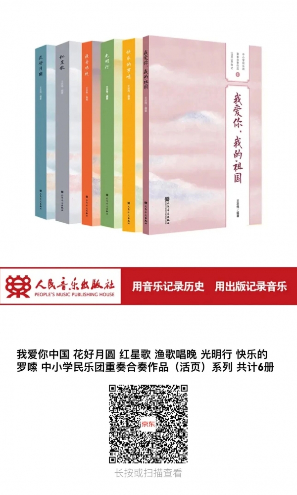 自2023年开始,人民音乐出版社陆续推出《中小学民乐团重奏合奏作品(活页)系列》,该系列是中国广播民族乐团原副团长王志伟长期从事中小学民乐团的组建、辅导、编曲等工作时,积累的适宜训练、演出、比赛的作品集锦,目前系列六册已全部出版面世。