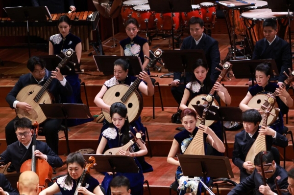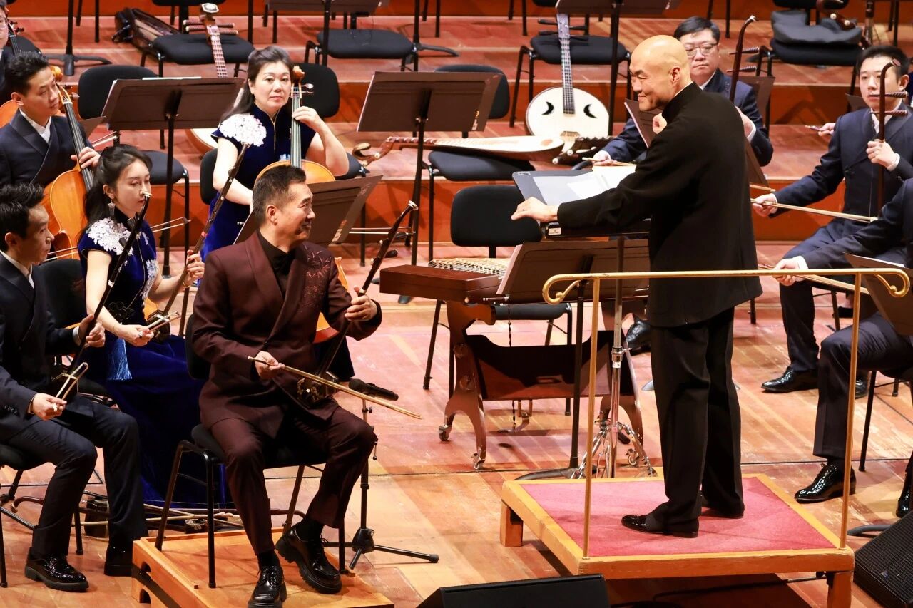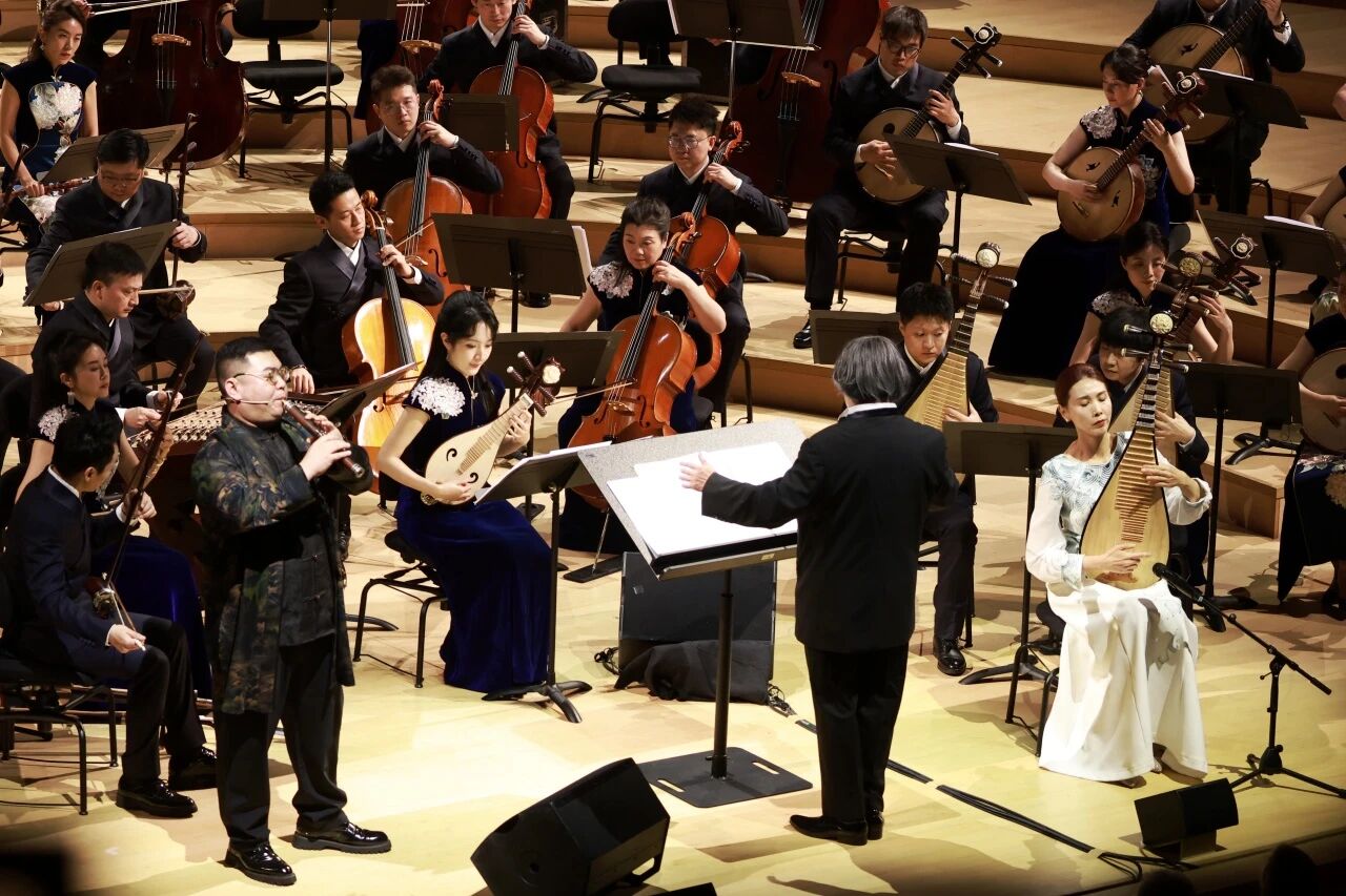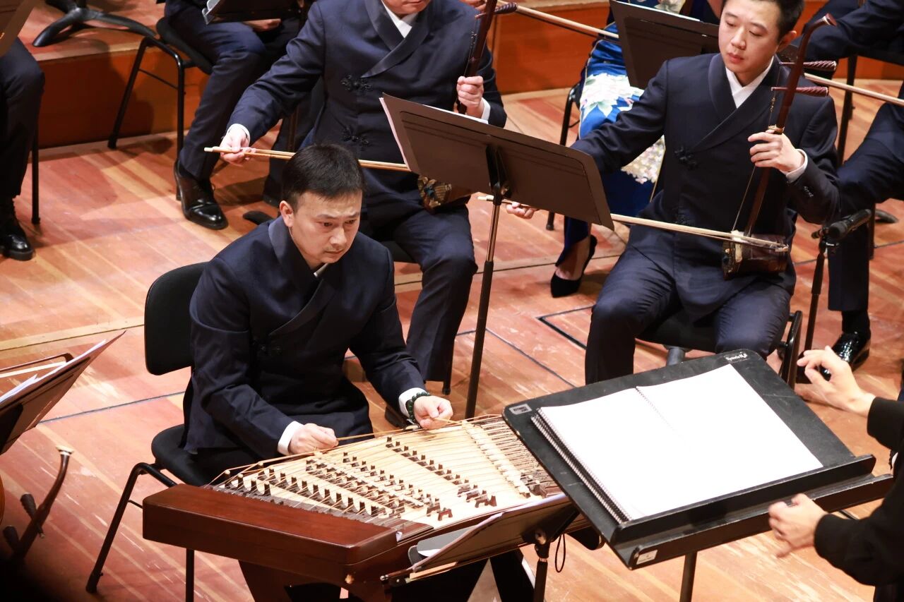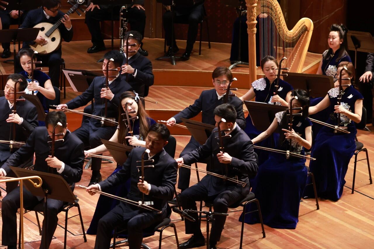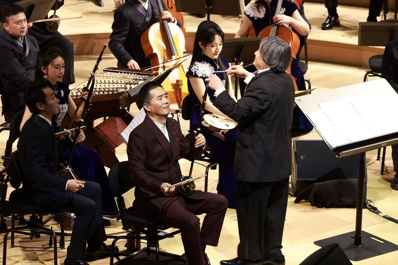 本场音乐会由中央民族乐团团长唐峰领衔,著名指挥家汤沐海执棒、胡琴演奏家金玥担任首席。汤沐海曾多次执棒中国春节民族音乐会,本场音乐会上,民族管弦乐队的交响化进程跃然眼前——他以深厚的西方交响乐修养为基,提炼出中国民族音乐曲目的戏剧张力,让琵琶的清脆,古筝的磅礴与大提琴的浑厚共鸣。这种“中西合璧”的艺术实践,正是中国民族音乐近年来积极对话世界、坚定推进自身现代化的缩影。