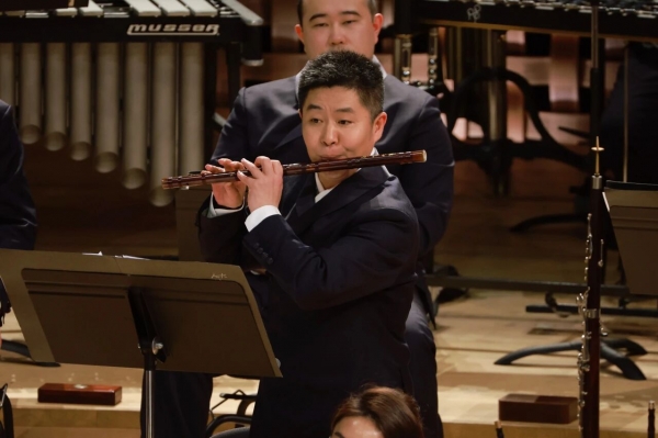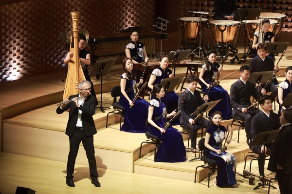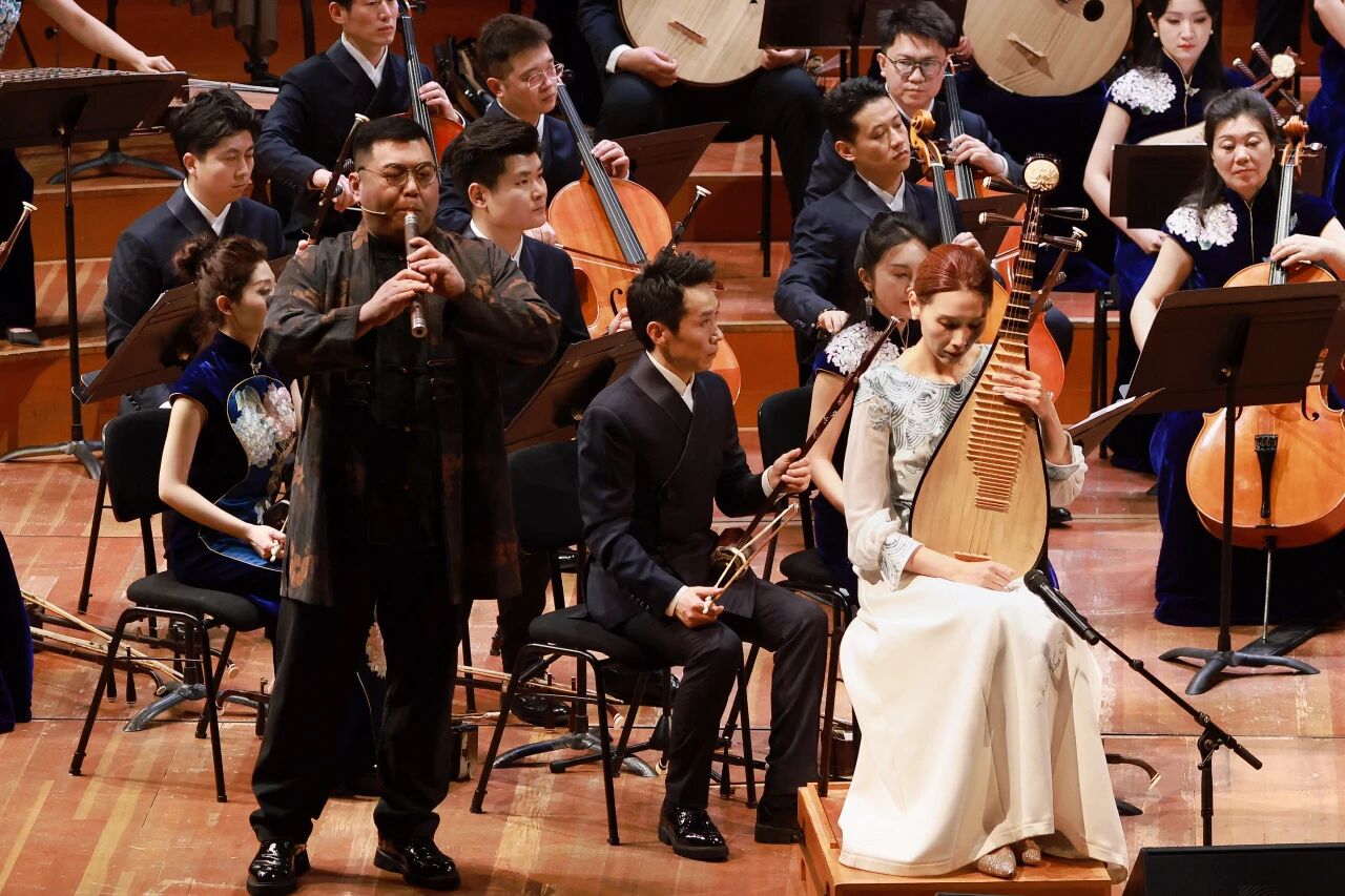 乐团返场时奏响法国经典名曲《卡门》,法国著名长笛演奏家让-马克·古戎登台,与中央民族乐团笛子声部首席富强展开了一场跨越国界的笛声对话。当旋律悄然流转,《花好月圆》的欢快旋律在观众雷鸣般的掌声中骤然响起,指挥家汤沐海缓步走下指挥台,与乐团成员及现场观众温情互动,将整场音乐会推向了最为炽热激昂的终章。