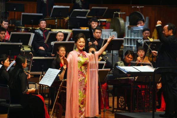 粤语金曲环节中,两位广东本土唱将接连登台。汪晨蕊这位从《中国新歌声》那英组冠军走向全国总决赛季军,首度与广东民族乐团合作,以温润细腻的声线演绎张学友创作的《讲你知》,深情缱绻;许乐与乐团十七年默契再续,《大地恩情》唱出对故土的眷恋,苍劲低沉、富有磁性的嗓音与民乐相得益彰。二人合唱的《正义柔情永在》经梁军编配,男女声交织,民乐的恢弘与粤语的韵味相融,将武侠世界的侠义与柔情展现的淋漓尽致。