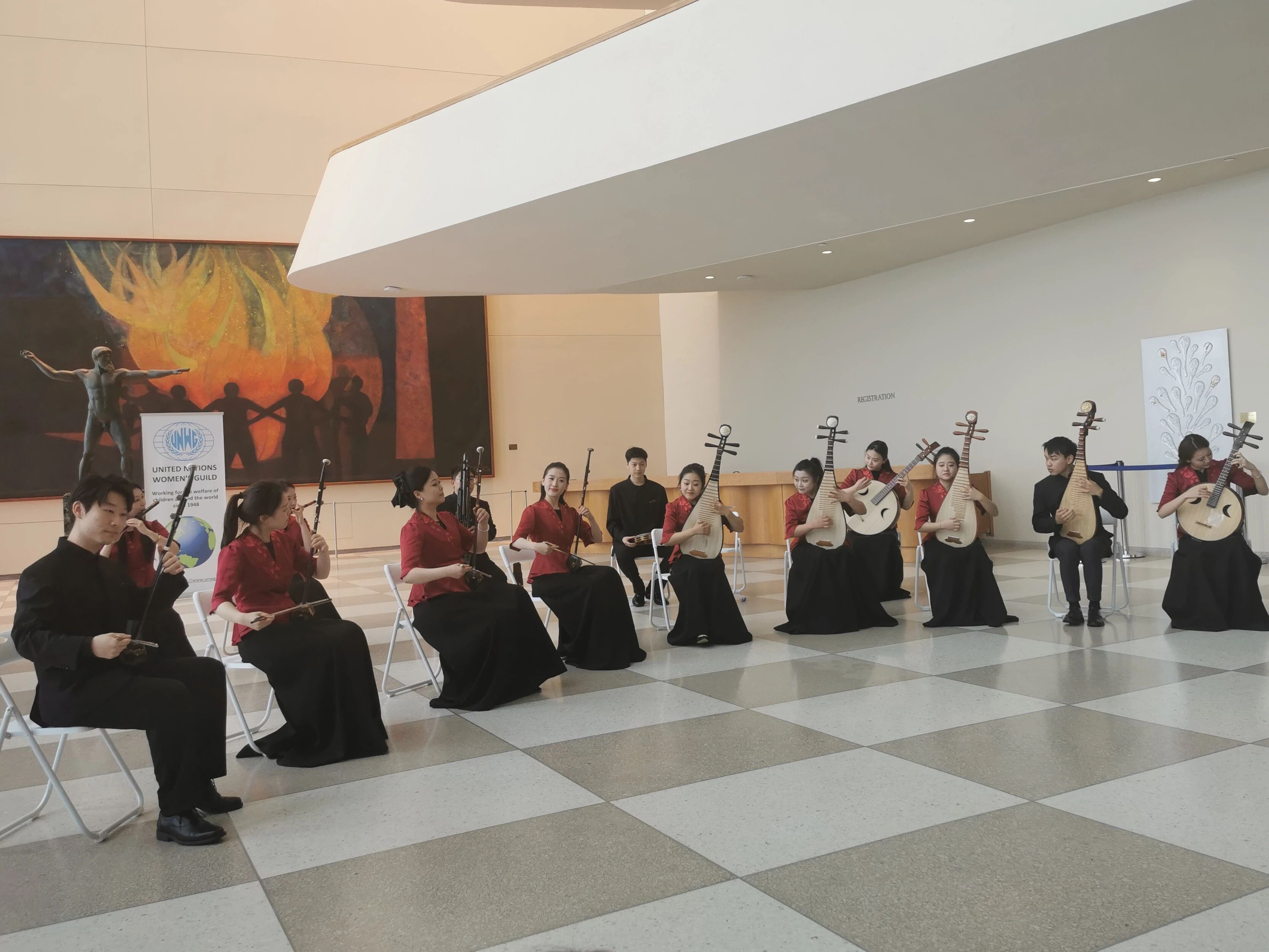 当地时间2月25日,来自中国最高音乐学府中央音乐学院的民乐师生在纽约联合国总部上演“快闪”音乐会,向世界传递新春祝福。本次“快闪”音乐会由中国文联、中国音协、中央音乐学院、联合国妇女协会共同举办,旨在让更多人关注妇女与儿童议题。当天,17位音乐家带来作品《喜相逢》《天山之春》《彝族舞曲》《良宵》《赛马》《牧童短笛》《雪绒花》《花好月圆》,其中《牧童短笛》《雪绒花》为专为儿童选曲。联合国各国工作人员、外交官及游客驻足聆听音乐会,并在结束后与音乐家们进行了交流。