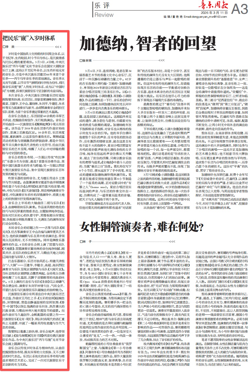 音乐会以传统岁时体系为精神内核,从曲目挖掘到整体布局,既有深厚的文化根脉,又不乏鲜活的时代表达。乐团以系统化的音乐季布局与精益求精的艺术匠心,完成了一次对民族管弦乐守正创新的有力实践。