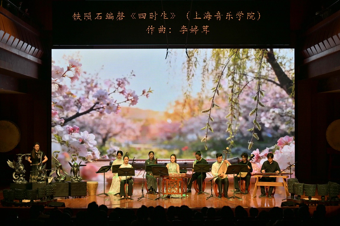 舞台上,一件名为“万籁寂”的特殊乐器——陨铁编磬(由珍贵铁陨石打造而成),成为了全场焦点。由上音师生创作并演奏的民族室内乐作品《四时生》,巧妙地将陨铁编磬与二胡、扬琴、琵琶、古琴等传统民族乐器相融合,以春生、夏长、秋成、冬藏为线索,与中华文明的礼乐传统展开一场跨越时空的对话。