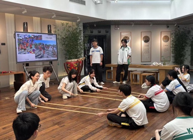 在黎族音乐研学课中,由志愿者团队成员曾雨桥同学带领同学们跨越山海,走进海南黎族音乐文化,解锁岭南少数民族的艺术智慧。 黎族民俗以黎锦、 民歌、乐器、舞蹈闻名于世,被人们称为“活着的史书”。课中最受欢迎的互动环节, 当属黎族竹竿舞,同学们在竹竿开合的节奏中欢快跳跃,在欢声笑语中近距离体验和欣赏到了海南黎族民俗音乐文化的独特魅力。