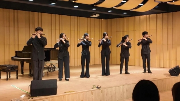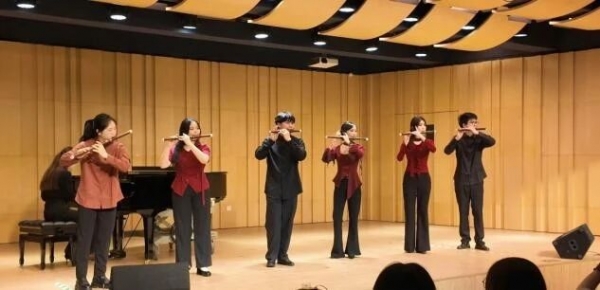 开场曲《喜讯传来乐开怀》笛声清亮,旋律热闹奔放,以欢快的节奏瞬间点燃现场气氛。随后一曲《江南》取材自《紫竹调》与《天涯歌女》,在保留经典优美旋律的同时融入现代编配,让熟悉的曲调焕发出新的动人韵味。笛子二重奏《顶嘴》则展现了另一种风格,演奏者运用滑音、历音、顿音等技法,生动模仿民间"顶嘴"场景,诙谐风趣,令人会心一笑。