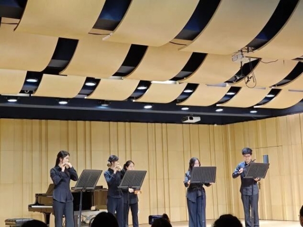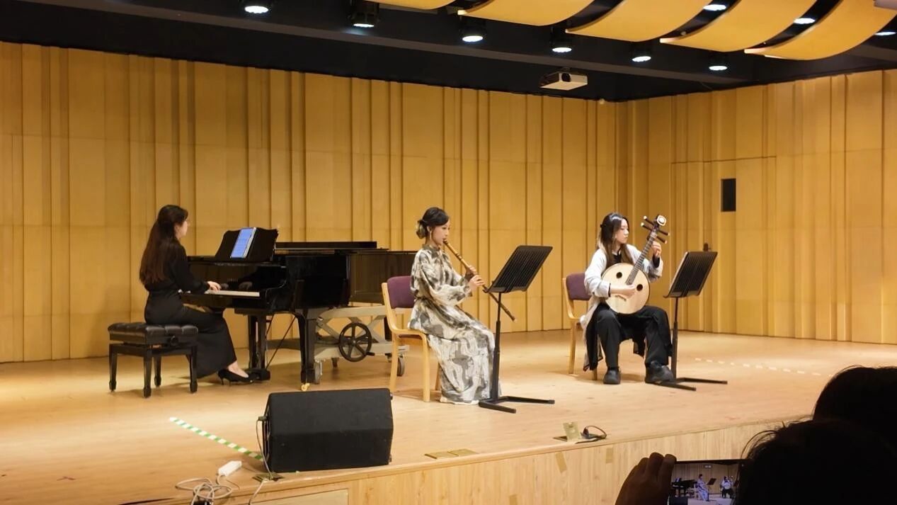 《牡丹亭·游园惊梦》,这首由孟庆华创作的曲子以笛箫对话讲述杜丽娘与柳梦梅的相遇相思,配合吴翊翎同学的钢琴伴奏,笛声如春风拂面,旋律婉转缠绵,将昆曲的隽永意境以纯器乐形式娓娓道来。而改编自经典老歌的《玫瑰玫瑰我爱你》则带来了意外惊喜,作曲家陈欣若的改编既保留了原曲的摇摆节奏,又加入戏剧性处理,让这首诞生于上世纪40年代上海的时代之声在竹笛的演绎下焕发新生。
