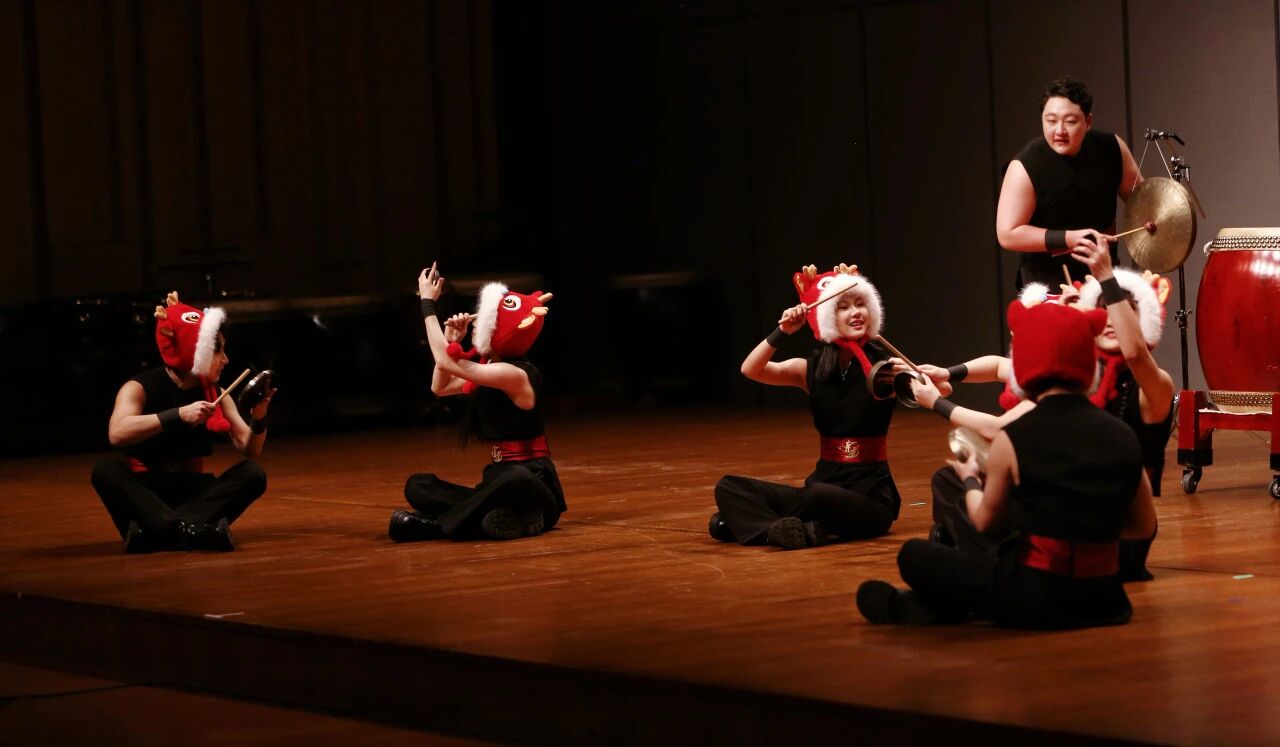 改编自传统民间锣鼓的《冲天炮》(编曲:李真贵)则以截然不同的风貌,点燃了现场的热烈气氛。乐曲节奏明快利落,层次分明,生动勾勒出节庆时分孩童嬉戏、鞭炮齐鸣的欢腾场景。演奏者们头戴“虎头帽”的创意造型,更让这份源自民间的、质朴而旺盛的生命力直观地跃然台上,证明了最“土”的乡音,亦能拥有最“潮”的舞台感染力。